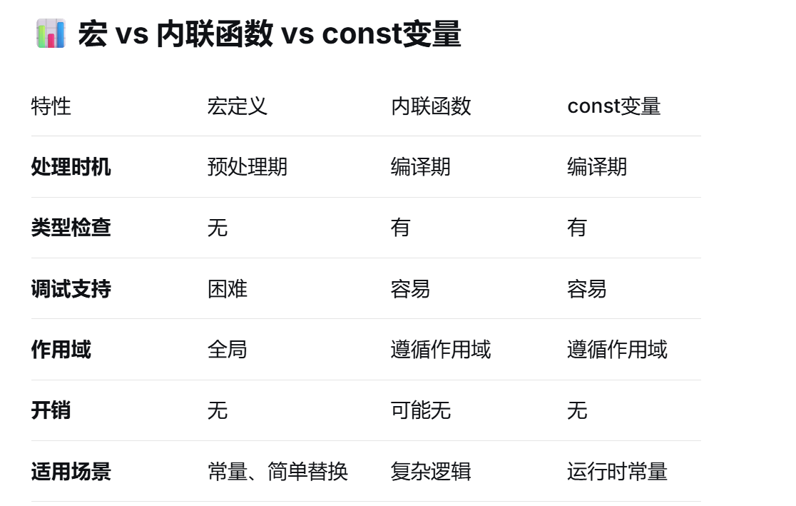 • 内联函数在编译时被处理。编译器会在调用内联函数的地方直接插入或替换内联函数的代码,从而避免函数调用的开销。内联函数有类型检查,也有作用域